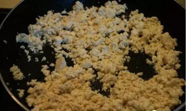 2、炒锅中倒少许油,将豆腐入锅中,翻炒到水分蒸发,豆腐成鸡刨的散状。