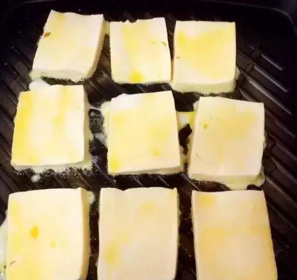 2、中火热锅,倒入橄榄油,放入豆腐块,两面煎炸5分钟左右至表面金黄。