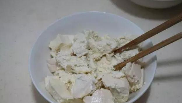 2、豆腐在开水中氽烫一下,压成泥。