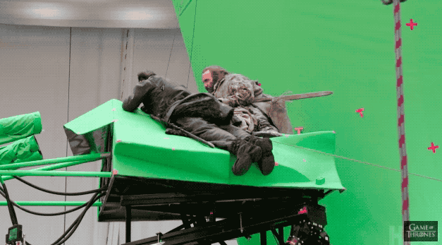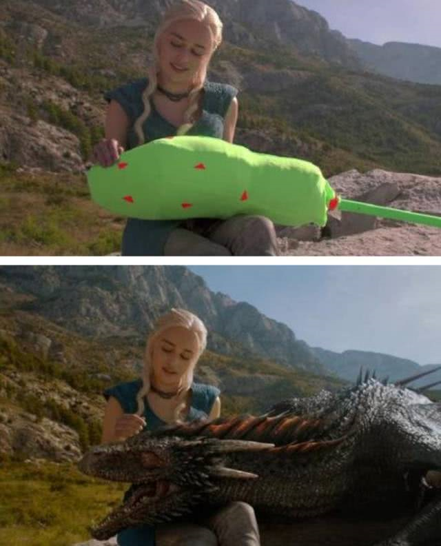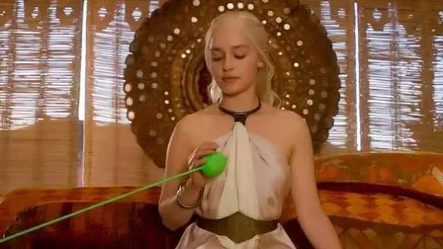 《权力的游戏》里的演员捧着的是一个绿色的玩偶,后期就化腐朽为神奇,做出了让人惊讶的龙。