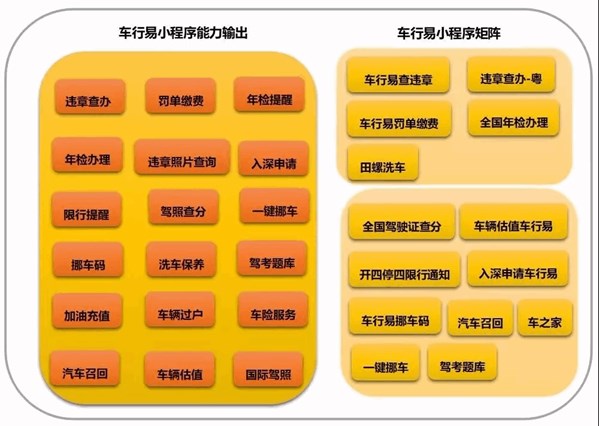 仅上线一年半,14款支付宝小程序的车行易已经累计为超过3000万中国车主提供了服务,从查违章、缴纳罚单、办理年检到洗车等等,车行易的小程序矩阵覆盖了车主服务这条产业链上的大部分服务。