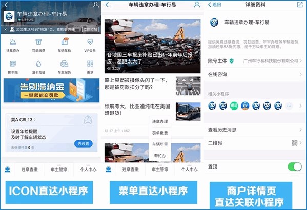 举例而言,车行易矩阵里最活跃的查违章支付宝小程序。车行易在这款小程序内个性化推荐交叉场景的小程序服务给用户,给用户提供更多服务,最终通过多样化的服务完善用户标签,为广大车主提供省时、省力、省心的一站式车务服务。